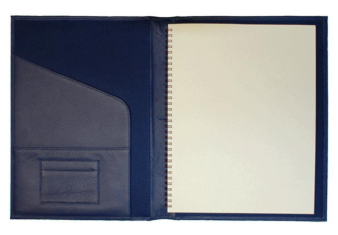 genuine leather cover. Inside document pocket and business card pockets. Pen slot. A 160 page letter size journal insert — blank or ruled is included. Black or British Tan Cover Colors.