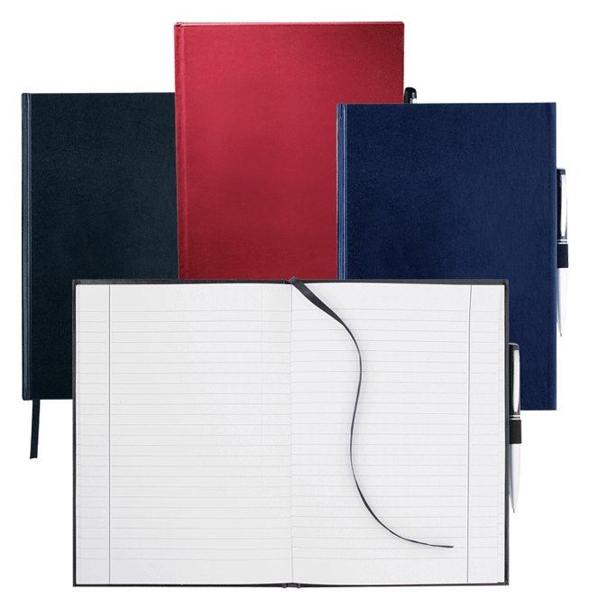 | ultrahyde bound notebooks. Elastic pen loop. Matching ribbon page marker. Has 72 sheets of gray—ruled paper. Black or Navy Cover Colors.