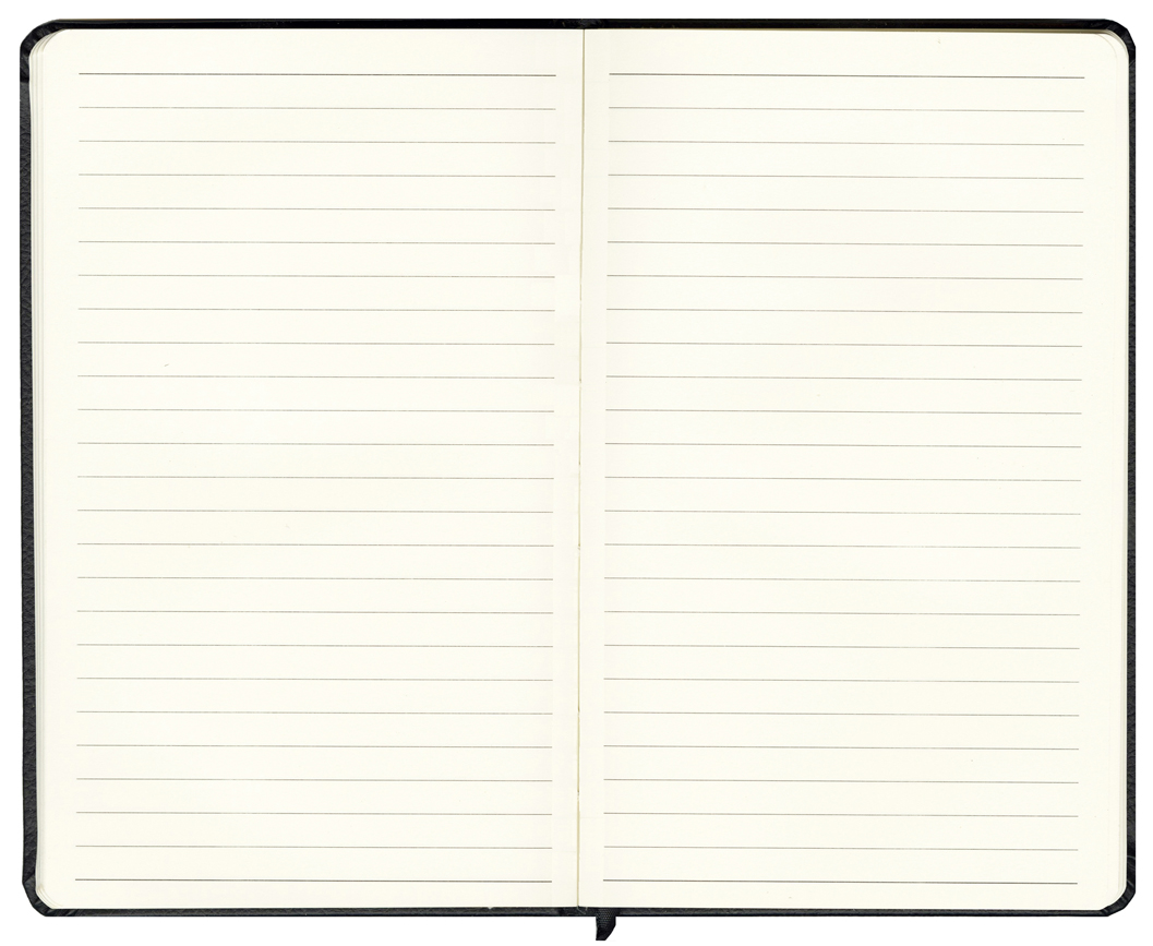 5" x 8 1/8" smooth perfect bound notebooks. Lay flat sewn binding. Has 120 sheets of natural ruled paper (measures 5" x 8"). Matching satin ribbon marker and elastic closure. Interior back pocket that expands for your important papers. Black, Red or Navy Blue Cover Colors.
